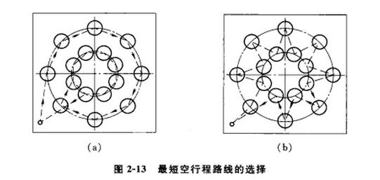 ?、诤侠戆才趴招谐踢\(yùn)動(dòng)路線 要加工如圖2-13所示的16個(gè)孔,按一般規(guī)律是先加工均布在同一圓周上的8個(gè)孔,再加工另一圓周上的孔(見(jiàn)圖2-13a),但對(duì)點(diǎn)位控制的數(shù)控機(jī)床來(lái)說(shuō),這并不是*短的空行程路線,如按圖2-13b所示的空行程路線進(jìn)行加工,則空行程距離的總和*小,因此可以提高生產(chǎn)率。